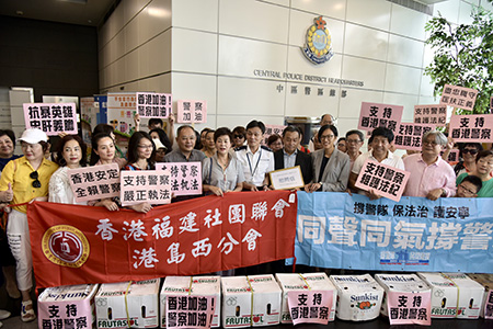 市民手持“支持警察 維護法紀”“盡忠職守 除暴安良”等標語,高聲呼喊“香港穩定 全賴警察”的口號,向警方致送水果及慰問信。警方代表接收慰問品後,與市民合影留念。警方代表對記者表示,非常感謝市民對前線警員的關心,警隊會繼續秉持專業精神,盡全力守護香港。