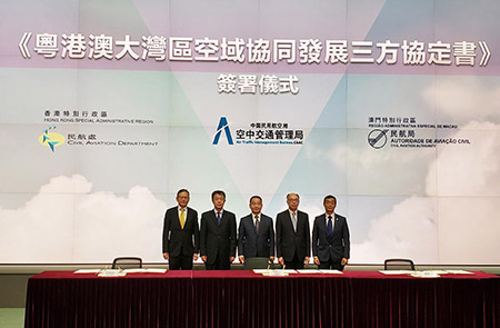 中國民用航空局空中交通管理局、香港特別行政區民航處和澳門特別行政區民航局就新的協同合作經過友好協商後,於前天在香港舉行會面並簽署 “粵港澳大灣區空域協同發展三方協定書”,三地將按照《粵港澳大灣區發展規劃綱要》對空域工作的指示,進一步發揮內地與港澳三方空管優勢,以創新發展促進三贏,共商共建,打造大灣區世界級機場群。