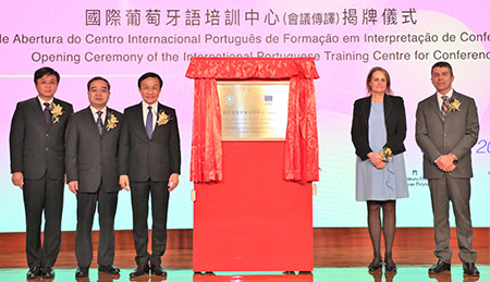 【特訊】在中華人民共和國成立七十周年、澳門特別行政區成立二十周年暨中葡建交四十周年之際,澳門理工學院於昨日成立國際葡萄牙語培訓中心(會議傳譯),透過與歐盟口譯總司的友好合作,進一步鞏固澳門作為中國與葡語國家商貿合作服務平台作用、豐富澳門及國家葡語人才培養、加強澳門與海內外國家地區葡萄牙語培養人才的合作並提高相關人力資源質素。澳門特別行政區政府社會文化司司長譚俊榮、中央人民政府駐澳門特別行政區聯絡辦公室教育與青年工作部副部長苟人民、歐盟口譯總司司長 Florika Fink-Hooijer、葡萄牙駐澳總領事歐冠溢、澳門理工學院院長嚴肇基共同主禮了開幕儀式。