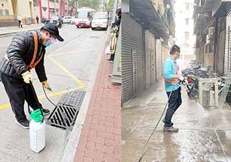 由昨日(二月十一日)開始,市政署進一步加強公共設施的清潔及消毒工作,在清洗街道的同時,安排清潔服務公司以專用噴霧器,將經稀釋的漂白水噴灑於渠道口、行人道欄杆,以及巴士站內的候車亭、遮雨棚、椅子及乘車信息牌等,加強清潔消毒工作,以確保市民大眾在使用相關設施時得到安全及衛生的保障,儘量減低病毒傳播的風險及條件。