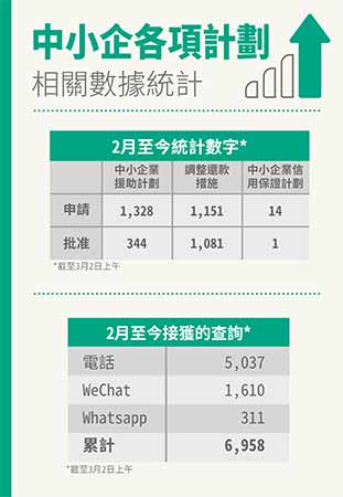 “調整還款措施"允許正在償還經濟局三項計劃(青年創業援助計劃、中小企業援助計劃、“天鴿"特別援助計劃)貸款的中小企業,可向經濟局申請將未來一期的還款下調至1,000元。自2月1日至3月2日上午,“調整還款措施"收到1,151宗申請,已批准1,081宗。