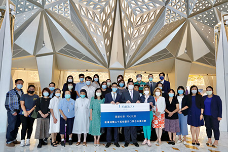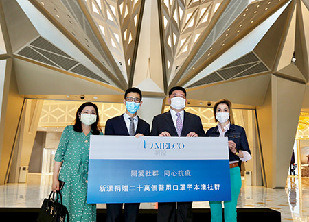 口罩捐贈儀式於今天假新濠天地摩珀斯舉行。在此同時,新濠員工亦繼續貫徹「小善大愛」理念,積極幫助本澳社區。新濠首席顧問黃昇雄博士、連同社工局代局長韓衛先生及研究及規劃廳廳長鄧潔芳女士,以及27位來自社工局轄下社福機構的代表出席是次儀式,包括:幸福安老院有限公司,澳門弱智人士家長協進會,浸信會澳門愛群社會服務處,澳門明愛,仁慈堂慈善會,澳門聽障人士協進會,澳門兒童發展協會,澳門聾人協會,松栢護老院一人有限公司,澳門紅十字會,嘉諾撒仁愛女修會,澳門特殊奧運會,聖母進教之佑孝女會(母佑會),母親會,澳門扶康會,菩提禪院,聖公會澳門社會服務處,澳門利民會,善牧會,澳門弱智人士服務協會,盈康慈善會,澳門婦女聯合總會,濠江護老會,澳門街坊會聯合總會,仁愛安老院有限公司,澳門基督教青年會,澳門工會聯合總會,