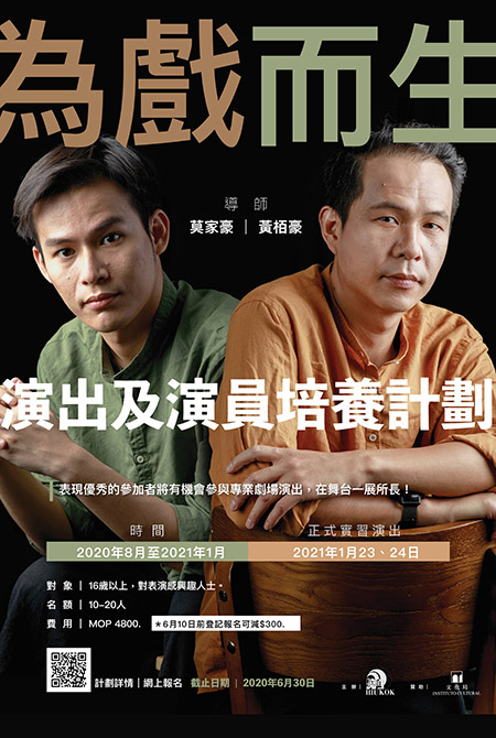 【特訊】曉角話劇研進社新一期「為戲而生演出及演員培養計劃」將於2020年8月開展,邀請資深劇場人黃栢豪、莫家豪作為重點戲劇導師。參加者將會展開連續六個月集訓,透過戲劇理論、身體訓練及實踐演出等方式,提升表演技巧、即興創作、劇本分析等能力,瞭解舞台各部門的技術運作,見證一個演出的誕生,成為澳門劇壇新力軍!