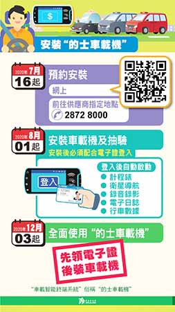 【特訊】昨日(7月16日)起,的士執照持有人可於網上或前往指定地點,預約由8月1日起陸續安裝“的士管理系統"的車載智能終端系統(俗稱“車載機”)。完成安裝車載機後,的士駕駛員須持有“電子的士駕駛員證”方可登入系統。