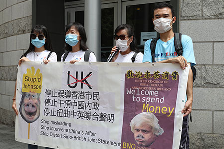 當日下午,“香江同心會”一行人來到英國駐港總領事館和平抗議。由於當局早前頒發“限聚令”,參與示威的僅4人。他們拉起寫著“停止誤導香港市民、停止干預中國內政、停止扭曲中英聯合聲明”的橫幅,並高喊“香港事務,中國內務,平等自由,尊重至上”的口號。