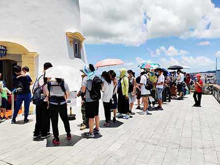 為慶祝7.18“海事及水務局日”,海事局每年都會在七月份舉辦一系列活動,今年東望洋燈塔如常在7月期間逢周六、日上午10時至下午時5時30分開放參觀。過去三個周末已經有近6,000人次參觀,最多市民參觀的時間是下午四時後,曾錄得一小時近200人次。因防疫需要,且由於燈塔內的空間有限和樓梯較為陡斜,工作人員會按情況實施人流控制措施,為免市民在塔外長時間等候和聚集,建議可選擇人流較少的時段錯峰參觀燈塔。