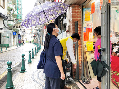 經濟局及生產力暨科技轉移中心人員前天(18)日曾到內港一帶商戶派發宣傳單張,提醒商戶及早做好防風防洪防浸準備及預防措施,有備無患,以免造成貨物及設備損失。