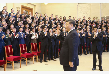 上午10時,習近平等來到京西賓館會議樓前廳,全場響起熱烈掌聲。習近平等走到代表們中間,同大家親切交流併合影留念。