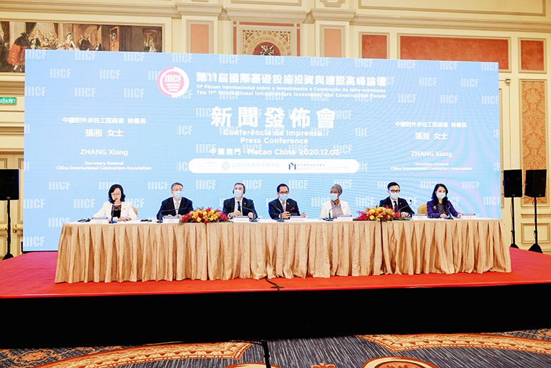 由中國對外承包工程商會、澳門貿易投資促進局共同主辦的「第11屆國際基礎設施投資與建設高峰論壇」昨日舉行簽約儀式及總結新聞發佈會。中國對外承包工程商會會長房秋晨、澳門貿易投資促進局主席劉偉明、中國商務部美大司副司長彭濤、印尼駐華大使DJAUHARI ORATMANGUN、肯尼亞駐華大使SARAH J.C. SEREM、烏拉圭駐華大使FERNANDO LUGRIS等出席新聞發佈會。