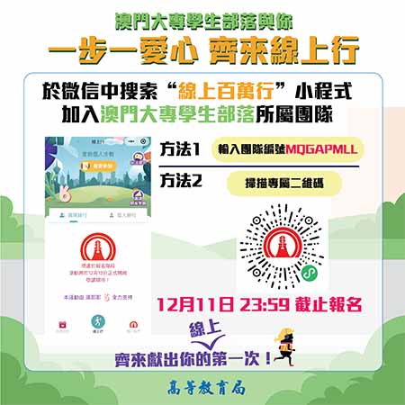 【特訊】為了鼓勵更多大專學生積極參與第三十七屆公益金百萬行,高等教育局在澳門日報讀者公益基金會的協助下,已於微信“線上百萬行”小程式開通名為“澳門大專學生部落”的團隊,歡迎在本澳或外地就讀的澳門大專學生加入,捐贈“微信運動”所記錄的步數,共襄善舉。