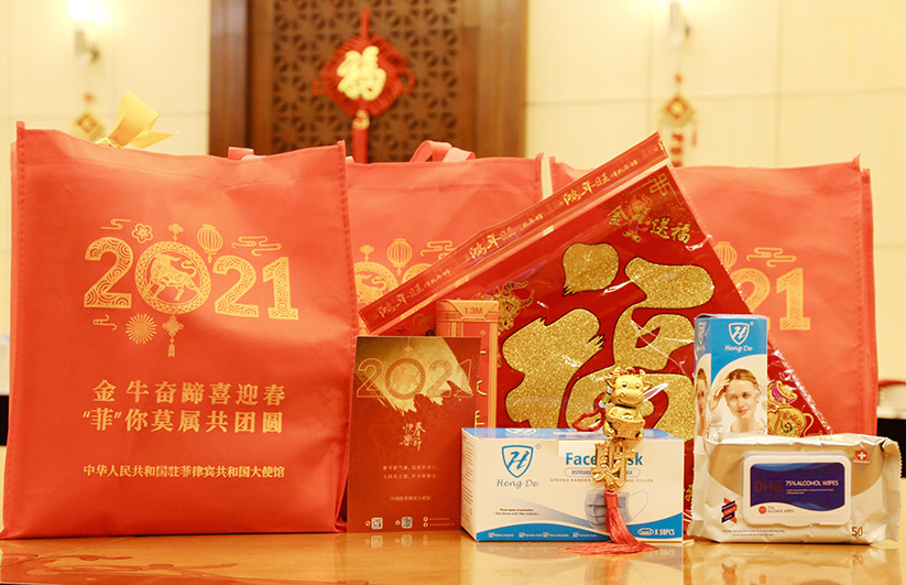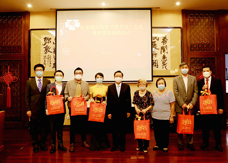 【中新社馬尼拉2月5日電】當地時間2月5日,中國駐菲律賓使館舉辦「春節包」發放儀式。中國駐菲大使黃溪連向在菲中國留學生、中資企業和媒體人員、困難僑胞等群體代表發放「春節包」,並向所有在菲同胞致以新春問候,鼓勵在菲同胞響應「非必要、非緊急、不旅行」的號召,留在菲律賓過年。駐菲使館王悅參讚兼總領事主持。