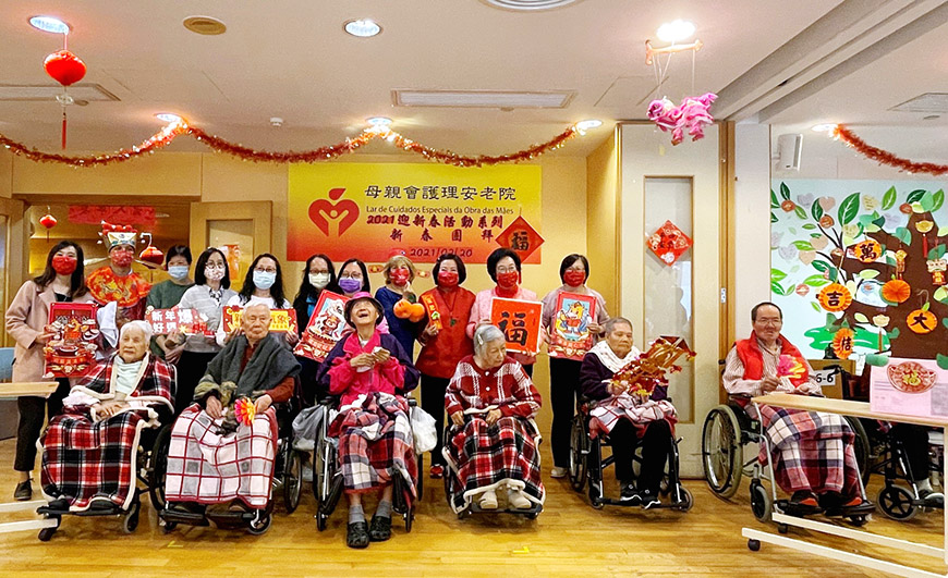 長者十分重視農曆新年這個喜慶大節日,為準備迎接牛年到來,母親會屬下安老機構臨近春節期間舉辦了「妙筆生“揮”迎春製作」、「區區有愛辦年貨」、「時來運轉行大運」、「闔家歡樂迎金牛」、「2021新春團拜」等等牛氣沖天迎新春系列活動,從院舍佈置以及賀卡製作著手,寓意「除舊佈新」;賀卡於外出辦年貨時送贈給各關愛及支持長者出行的社區商戶,以送上節日祝賀,同時表示謝意和鼓勵;在行大運遊車河時,途經熟悉的社區,既可欣賞美麗的賀年燈飾,也能感受社區的變遷,由於新冠疫情的關係,市面人流沒像以往暢旺,亦無減院友和家屬興奮的心情,大家都十份雀躍,流連忘返;院友把在超市購買到的賀年佳品佈置全盒,又透過繪畫和不同的圖片代替文字,製作出具創意的賀年揮春,如橫財就手及大吉大利等新年祝福語;大年初一早上於院舍內上奉「頭炷香」,祈求大家在新一年健康快樂,事事大吉;下午有闔家歡樂拜年環節,以錄影的形式向身處外地的親友「跨區拜年」拉近距離,將傳統習俗與現代科技結合呈現,闔家團圓;新春團拜中,進行互動遊戲助興,出席的母親會賀定一會長、方靜儀副理事長、高曼娜理事及郭綺梅名譽顧問等向大家拜年和送上節日祝福,祝願眾院友及家屬身心健康,生活愉快,場面熱鬧;在大年初二開年迎財神,工作員製作氣球炮仗,讓長者們一同刺破氣球,模擬燒炮仗的聲音效果,同場又製作放煙花道具,玩意樂在其中,最後是財神出遊,給長者送上心意卡及即影即有相片作為祝福小禮物,增添節日氣氛。