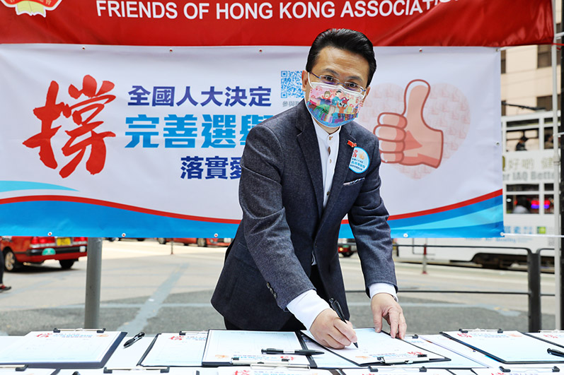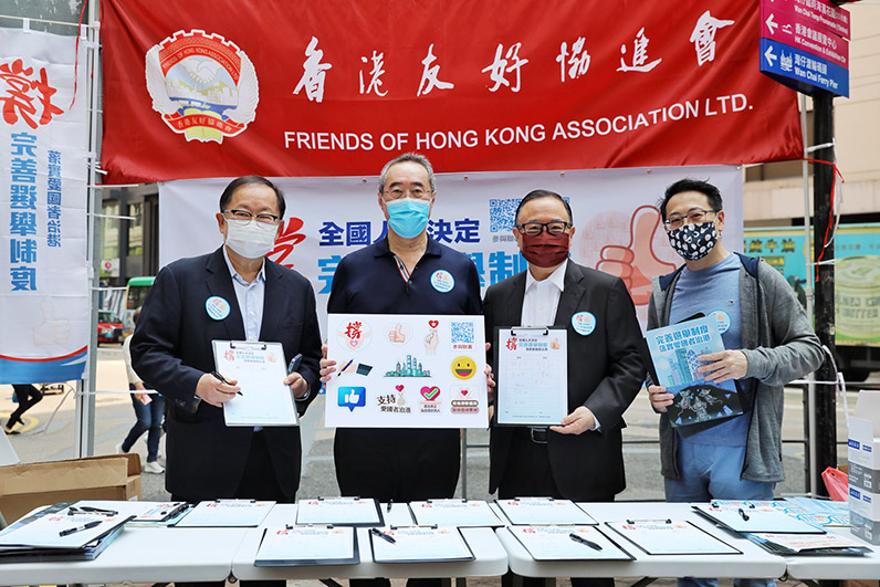 當日, 「香港友好協進會」在灣仔港鐵站附近擺設街站,一共約50名政界人士分批到場,收集支持者的簽名。記者現場看到,全國人大常委會委員譚耀宗、港區全國人大代表吳秋北,以及全國政協常委唐英年等政界名人,都先後前來簽名支持。身為香港工會聯合會(工聯會)會長的吳秋北表示,全國人大高票通過完善香港選舉制度的決定,有望令香港更好實踐「一國兩制」和「愛國者治港」,結束香港長期以來的政治爭拗、內耗,以至破壞民生的亂象。