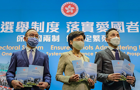 林鄭月娥表示,她和特區政府管治團隊堅定支持全國人大常委會通過新修訂的基本法附件一《香港特別行政區行政長官的產生辦法》和附件二《香港特別行政區立法會的產生辦法和表決程序》,完善香港特區選舉制度,建立一套符合“一國兩制”制度體系、符合香港實際情況、落實“愛國者治港”的政治體制。