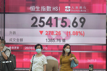 【香港中通社8月26日電】 香港股市連跌第二日,交投進一步縮減。恒生指數26日收報25415點,跌278點,大市全日成交1385.76億元(港元,下同),較上個交易日縮減一成半。