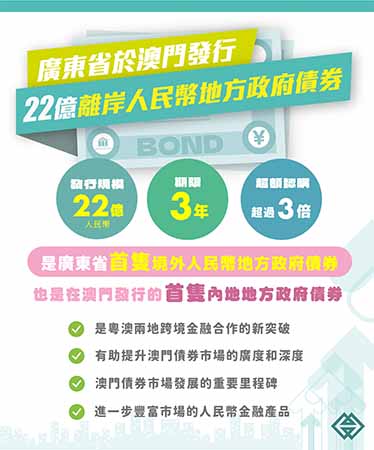 今年是國家“十四五”規劃的開局之年,在粵港澳大灣區融合發展的背景下,廣東省在澳門發行離岸人民幣地方政府債券,是粵澳兩地跨境金融合作的新突破,也是繼2019年國家財政部首次在澳門發行國債後,澳門債券市場發展的另一個重要里程碑。本次發行將有助提升澳門債券市場的廣度和深度,為澳門債券市場的穩步發展奠下更穩固的基礎,也將進一步豐富澳門離岸市場的人民幣金融產品,促進人民幣國際化。