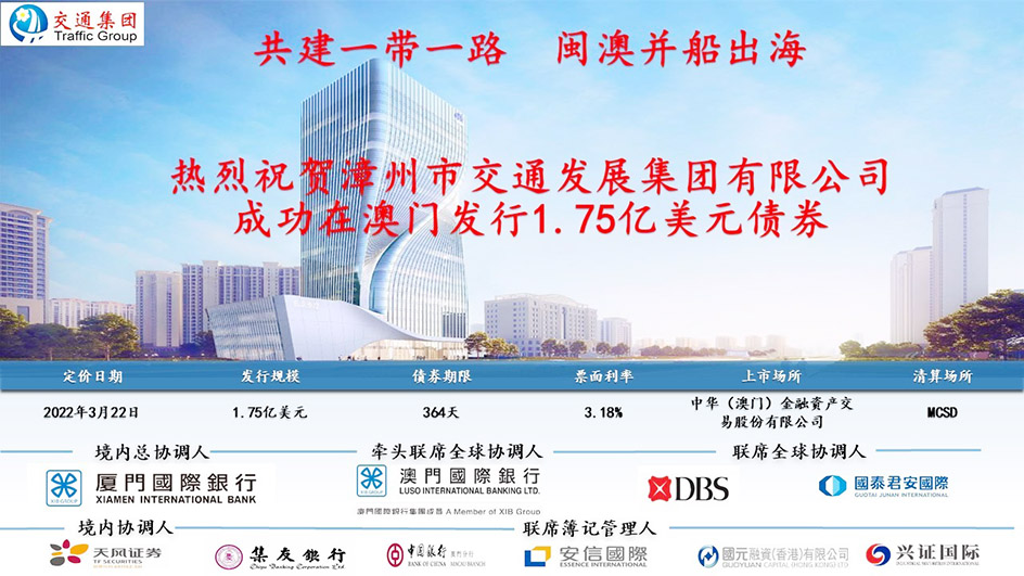 【特訊】2022年3月22日,澳門國際銀行成功服務福建省漳州市交通發展集團有限責任公司在澳門發行1.75億美元公募債券。這是繼3月10日該行成功服務福建晋江城建赴澳发债融资後,推進閩籍企業赴澳發債的又一個突破性成果,是澳門中央證券托管結算系統(MCSD)啓動以來全國地級市首單赴澳門市場發行的債券,亦是MCSD啓動以來全國非金融類企業發行的最大發行規模及最低票面利率的債券。