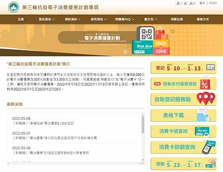 “電消優惠”專題網頁(www.dsedt.gov.mo/econsumo/zh-hant/index.jsp)在過去基礎上作出優化,訊息豐富,分類清晰。網頁內容包括:相關法規、最新消息、時間表、登記及領取流程、表格下載、自助登記服務點、移動支付優惠資訊及消費卡查詢等。