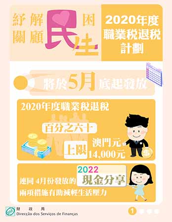 【特訊】為應對新冠肺炎疫情的持續影響及減輕澳門居民生活負擔,財政局於5月27日起向2020年12月31日持有澳門居民身份證的合資格157,000名職業稅納稅人,退還百分之六十應繳並已繳納的2020年度職業稅稅款,上限為14,000澳門元。是次涉及的退稅總金額約838,214,200澳門元。