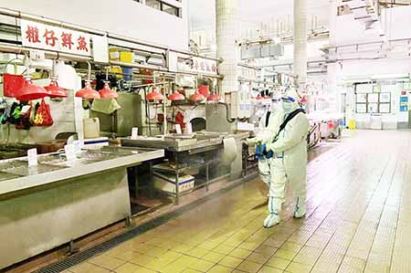 自疫情發生以來,市政署持續加強對各市政街市的清潔消毒,除加密以稀釋漂白水清抹公共設施的頻次,每晚收市後更會進行徹底的清洗及消毒,以高壓水槍清洗並更增加了以噴霧機強化消毒,保障設施及環境衛生,強化抗疫措施,減低疫病傳播風險。