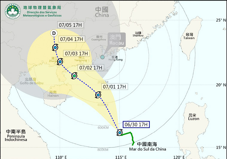 【特訊】氣象局表示,位於南海中部的熱帶低氣壓已增強為熱帶風暴,並命名為「暹芭」。預料「暹芭」緩慢向西北方向移動,大致趨向廣東西部至海南島一帶。週五(一日)凌晨至早上,本澳發出三號風球的機會偏高。此外,預料受菲律賓以東的另一低壓區發展所影響,「暹芭」的強度及路徑未來仍存在較大變數。如其採取較偏北路徑更接近本澳或於近岸加強,屆時不排除改發更高風球的機會。