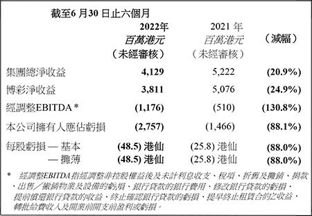 •本公司之附屬公司澳娛綜合度假股份有限公司(「澳娛綜合」)於2022年上半年的博彩淨收益為38.11億港元,2021年上半年則為50.76億港元。