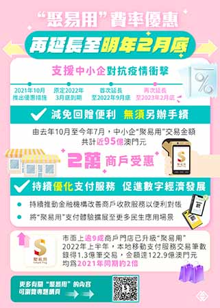 【特訊】為紓緩中小企在疫情持續下的經營壓力,澳門金融管理局再協調金融機構,將中小企「聚易用」交易手續費減免或回贈措施,延長至明年2月底。