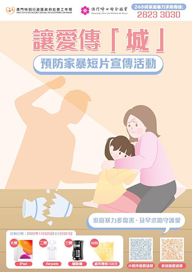 為推動構建預防家暴的社會環境,社會工作局與婦聯總會今年除合辦“全城零暴力”預防家暴系列活動外,更將於十一月廿五日至十二月卅一日期間,合辦“讓愛傳‘城’”預防家暴短片宣傳系列活動,推出預防家暴主題的系列宣傳影片。而為加強宣傳效果,活動特別在六部巴士上設計以主動求助、情緒管理及關顧子女等主題外觀,行走路線包括2、8、23、30、30及56號,寓意著廿四小時家暴求助專線28233030、5間社會工作中心和6間家庭社區服務中心等,全社會合力推動預防家暴,並將於一百八十八部巴士上播放有關宣傳影片。