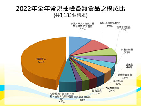 為保障消費者的食用安全,市政署持續透過恆常食品監測機制,評估市售食品的風險,依據流通市場的食品種類和特點,開展“時令節日食品”、“一般市售食品”與“餐飲食品”抽檢計劃。抽檢範圍包括本澳各區外賣店、飲食場所、零售場所及學校等,抽取各類即食餐飲食品、飲品、糧油食品、零食等。在二零二二年第四季,共抽取八百六十一個樣本進行化學、微生物學及輻射水平檢驗,其中有七個樣本未能通過檢測。