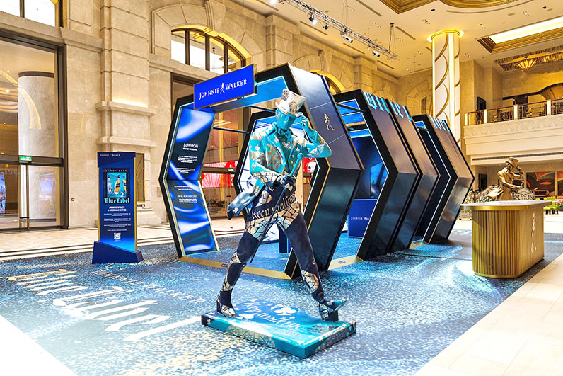 Johnnie Walker Blue Label 品牌標誌性的「邁步向前的紳士」(Striding Man),象徵著向前 邁進的精神與活力。為了進一步鼓勵這種「永遠向前」(Keep Walking)的價值觀,品牌特 別聯乘澳門本地西洋書法藝術家阿堅奴(Aquino Da Silva),為體驗店展示的「邁步向前的紳 士」換上新裝並繼續與大家一起闊步前進。新裝的概念主要是使用澳門葡式石仔路的花紋造成 一種漸層的層次感,藉此融入澳門元素。此外配合經典的哥特式黑體字體,重新演繹品牌理念 「永遠向前」(Keep Walking)的訊息。
