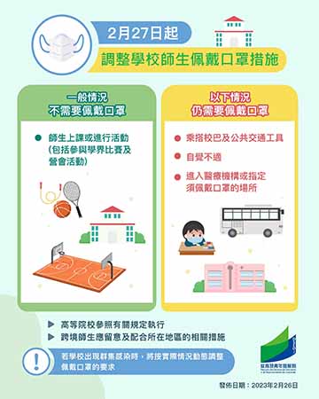 【特訊】教育及青年發展局表示,因應新型冠狀病毒感染應變協調中心調整要求佩戴口罩的措施及發出相關指引,考慮到放寬口罩措施有利學生成長和身心發展,尤其對幼兒及語言方面教與學有更好的效果,教青局經與衛生部門會商及聽取教育界的意見,宣佈由2月27日起,在一般情況下,非高等教育學校師生在上課或進行活動時(包括參與學界比賽及營會活動)不需佩戴口罩,高等院校參照有關規定執行。根據衛生部門的指引,為保障師生的健康,以下情況師生仍有需要佩戴口罩:
