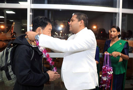 斯裡蘭卡旅遊部長費爾南多和中國駐斯大使戚振宏等為剛下飛機的中國遊客戴上歡迎花環。費爾南多說,很高興前來迎接首批中國旅行團,期待更多中國遊客到訪,從而提振斯裡蘭卡旅遊業乃至整體經濟。