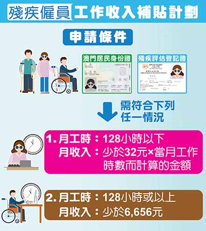 凡持有由社會工作局發出有效的殘疾評估登記證的本地僱員,如按月累計工作總時數少於128小時,且當月工作收入少於《僱員的最低工資》規定的每小時最低工資金額32澳門元乘以當月實際提供工作時數而計算的金額;又或符合按月累計工作總時數等於或多於128小時,且當月工作收入少於《僱員的最低工資》規定的每月最低工資金額6,656澳門元,均可作出申請。