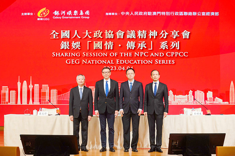 【特訊】銀河娛樂集團(下稱「銀娛」) 作為一家植根澳門、背靠祖國的華資企業,一直積極以多元舉措向團隊成員、本澳青少年以至社區普及國情教育,深化其對國家最新發展動態及成就的認識及理解。連續多年由中央人民政府駐澳門特別行政區聯絡辦公室(下稱「中聯辦」)經濟部指導以及銀娛主辦的「全國人大政協會議精神分享會 — 銀娛『國情‧傳承』系列」假銀河國際會議中心之銀河演講廳舉行。是次活動邀請到中聯辦經濟部副處長楊毅出席指導;並邀請到全國人大代表蕭志偉、全國政協常委劉雅煌以及全國政協委員、銀娛副主席呂耀東就今屆「兩會」,以線上線下形式向合共約800名銀娛管理層成員分享真知灼見以及個人體會。