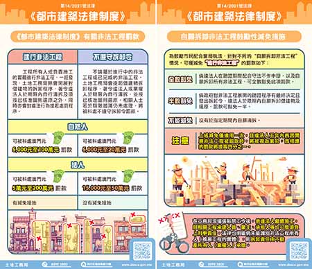 特區政府提醒,倘違法人收到違法事項通知後應盡快配合處理,法律也訂明了罰款減免措施以推動自願拆除非法工程。同時,業主應對樓宇進行定期維修保養,以保持樓宇良好的使用狀況,避免對公眾安全構成威脅。
