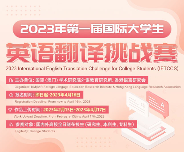 【特訊】由國際(澳門)學術研究院外語教育研究所與香港語言研究會聯合舉辦的「2023年第一屆國際大學生英語翻譯挑戰賽」(2023 International English Translation Challenge for College Students,簡稱IETCCS)圓滿落幕,澳門分賽區顧問高月生期望,透過舉辦國際大學生英語翻譯挑戰賽,助力培養「一帶一路」倡議所需的英語人才。
