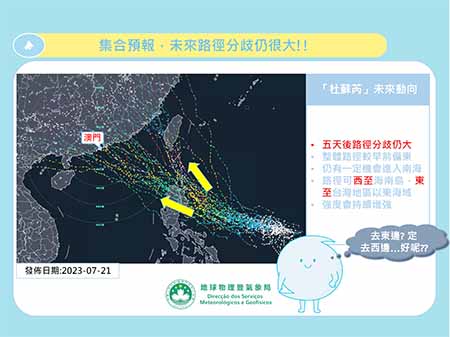 氣象局指出,按目前預測,雖然「杜蘇芮」的移向仍充滿不確定性,但受其外圍下沉氣流影響,預料下週天氣:(一)因應風力微弱,廣東沿岸容易出現極端高溫;(二)高溫觸發熱對流,內陸容易形成雷雨,或南移影響本澳;(三)強雷雨有機會帶來強烈陣風。