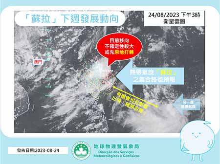 氣象局指出,按照目前數值模式顯示,位於菲律賓以東的熱帶氣旋「蘇拉」,由於引導氣流較弱,加上西北太平洋上有另一熱帶氣旋將會發展,因此預料「蘇拉」未來數日或先原地打轉,再於下週移向中國東南部沿岸至台灣地區一帶,但目前的預報模式仍有較大的不確定性,會否進入南海仍存變數,氣象局將密切監察其最新動向。由於「蘇拉」有機會增強至颱風級別或以上,故不論最終有否熱帶氣旋進入南海,預料下週中期本澳將受其外圍下沉氣流疊加較弱的東北風影響,日間天氣酷熱,且高溫有機會觸發午後雷雨,氣象局提醒巿民持續關注最新天氣資訊。