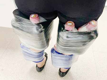 海關表示,本月五至十一日分別在關閘口岸、青茂口岸及內港客運碼頭截獲九十五宗進出境個案。其中在本月八日晚,關員於關閘口岸揭發一名出境女子將六支中國白酒綑綁於雙腳。同日晚上,關員在青茂口岸出境旅客檢查區截獲一名男子,揭發其利用塑膠膜,將二十八部舊手機綁纏於上半身及胯下。