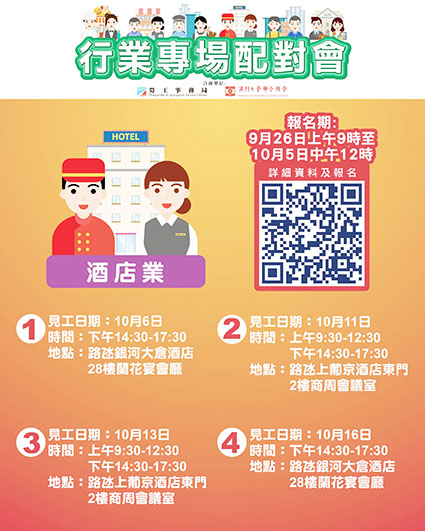 10月6日下午舉辦酒店業配對會,提供18個職位空缺,涉及前臺服務員、貴賓專員及禮賓服務員。