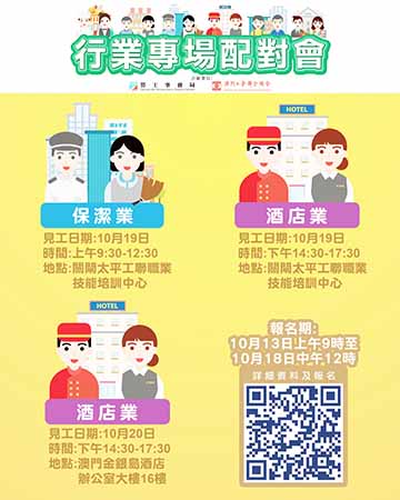 10月19日下午舉辦酒店業配對會,提供149個職位空缺,涉及會計部經理、資訊科技部經理、人力資源部主任、人力資源部助理、審計員、會計部文員、平面設計師、工程技工及前台接待員等。以上兩場配對會在澳門工聯職業技能培訓中心(關閘馬路101-105A號太平工業大廈第一期1樓)舉行。10月20日下午舉辦酒店業配對會,提供26個職位空缺,涉及前堂主管、值班經理、人事及行政文員、會計文員、採購文員、訂房代理及管家部協調員等。配對會在澳門金銀島酒店辦公室大樓16樓舉行。