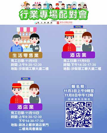 【特訊】為協助有求職需求的澳門居民盡快就業,以及為緩解業界的人資需求的壓力,勞工事務局與澳門工會聯合總會合作11月第二周舉辦3場行業專場配對會,合共提供360個空缺。報名日期為11月3日上午9時至11月8日中午12時。