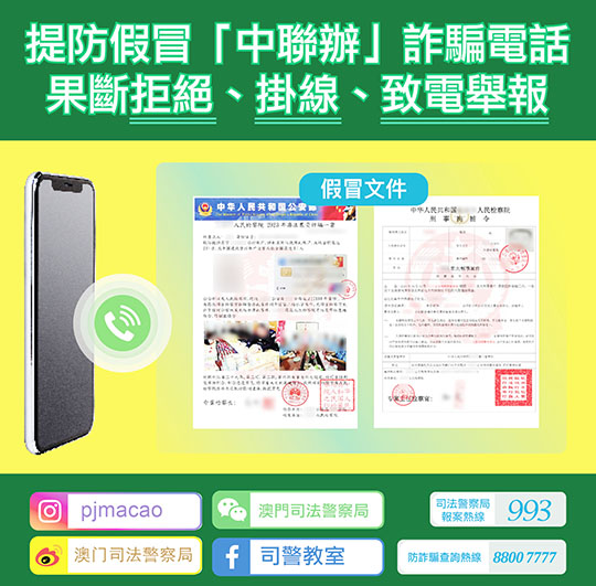 【特訊】司法警察局表示,電話詐騙手法層出不窮,近月騙徒會假冒「澳門中聯辦」人員致電事主,並直接說出事主之姓名及證件號碼,訛稱事主於內地牽涉重大刑事案件,繼而轉駁電話至假公安機關;隨後騙徒會要求事主進行視頻辦案、共享屏幕、接受資金審查,甚至執行「特別任務」以「戴罪立功」等。
