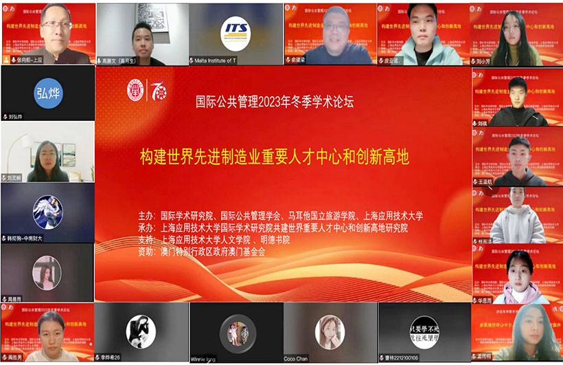 【特訊】日前,由國際(澳門)學術研究院、國際(澳門)公共管理學會、馬耳他國立旅遊學院、上海應用技術大學主辦,上海應用技術大學國際(澳門)學術研究院共建世界重要人才中心和創新高地研究院承辦,上海應用技術大學人文學院、明德書院支持,澳門基金會《學術項目資助計劃》資助之「國際公共管理2023年冬季學術論壇」圓滿落幕。是次論壇主題為構建世界先進製造業重要人才中心和創新高地,多名專家、學者、研究員參與,會議連續兩天採用線上線下相結合方式進行,與會者冀研究成果助力構建世界先進製造業重要人才中心和創新高地。