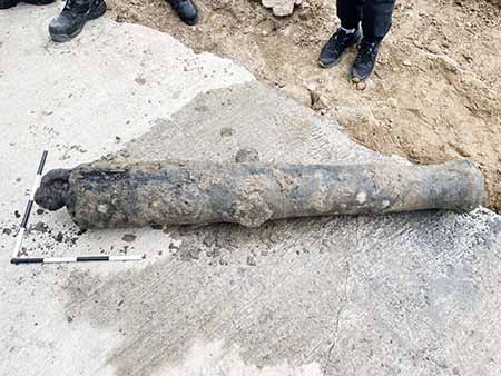 文化局表示,於昨日(二十三日)上午十一時許接報,於筷子基北街工程地盤內發現古炮,隨即已派員到場對古炮及其出土位置等作現場環境調查、儀器定位,以及對古炮進行三維掃描等記錄工作。經初步測量,古炮長約一點三八米,炮口內徑約八十毫米,出土時缺一側炮耳。
