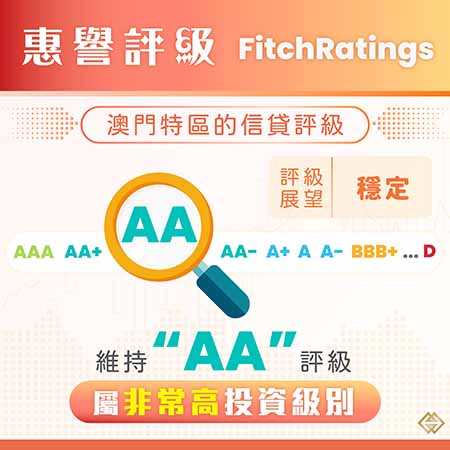 惠譽維持澳門特區屬於第三高級別的“AA”評級,主要是基於特區非常穩健的財政和對外收支狀況,以及政府在經濟調整期仍堅守審慎的財政管理。與此同時,惠譽預期穩定的旅遊業復甦和非博彩投資將對澳門的經濟前景提供支持。
