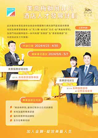 【特訊】為進一步培育本地人才並提供發展階梯,勞工事務局和美高梅金殿超濠股份有限公司(下稱“美高梅")合作推出“美高梅獅展非凡酒店人才發展計劃"(下稱“計劃"),以“先入職、後培訓”方式,為有志投身綜合休閒旅遊服務行業的澳門居民提供全方位培訓及發展階梯,計劃由4月23日起接受申請。