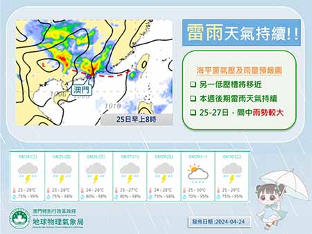 氣象局表示,隨著昨日(二十四日)低壓槽有所減弱,本澳連日出現的雷雨天氣將稍為減緩。但是,預料另一道低壓槽將於稍後移近華南沿岸,並將於本週後期持續影響本澳,按現時的預測資料顯示,稍後將有另一道低壓槽移近華南沿岸,預料本澳今日(二十五日)起天氣將再度變得不穩定,驟雨及雷暴將再次增多。同時,受暖濕的西南氣流影響,未來兩三日(二十五至二十七日)雨勢有時會較大,風力亦會較強。