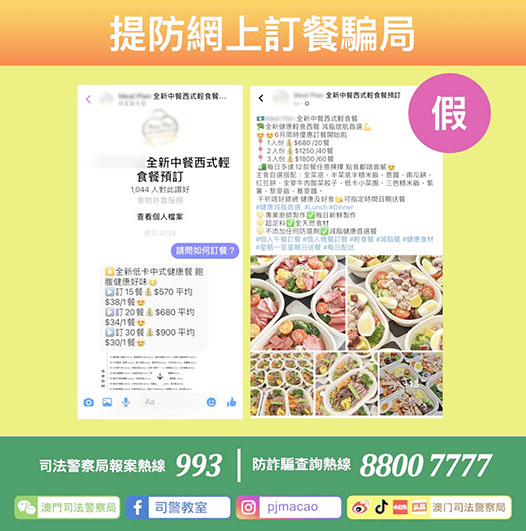 司警局反詐騙協調中心提醒市民:1. 切勿貿然與陌生網上帳號進行交易,尤其訂購餐品,應選擇具有實體門店的商戶;2. 進行網購前需謹慎,小心防範各類型“先付款、後送貨”的網購詐騙,尤其相關交易並非透過可信賴的第三方平台作出;3. 倘懷疑涉詐,可使用司警局“反詐程式”查核風險指數,又或致電防詐騙查詢熱線8800 7777或報案熱線993求助。