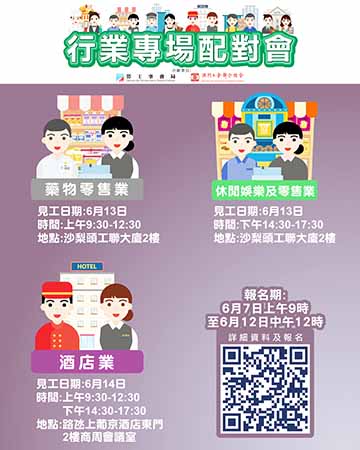 6月13日上午舉辦藥物零售業配對會,提供66個職位空缺,涉及售貨員及藥劑師。同日下午舉辦休閒娛樂及零售業配對會,提供22個職位空缺,涉及店務員。